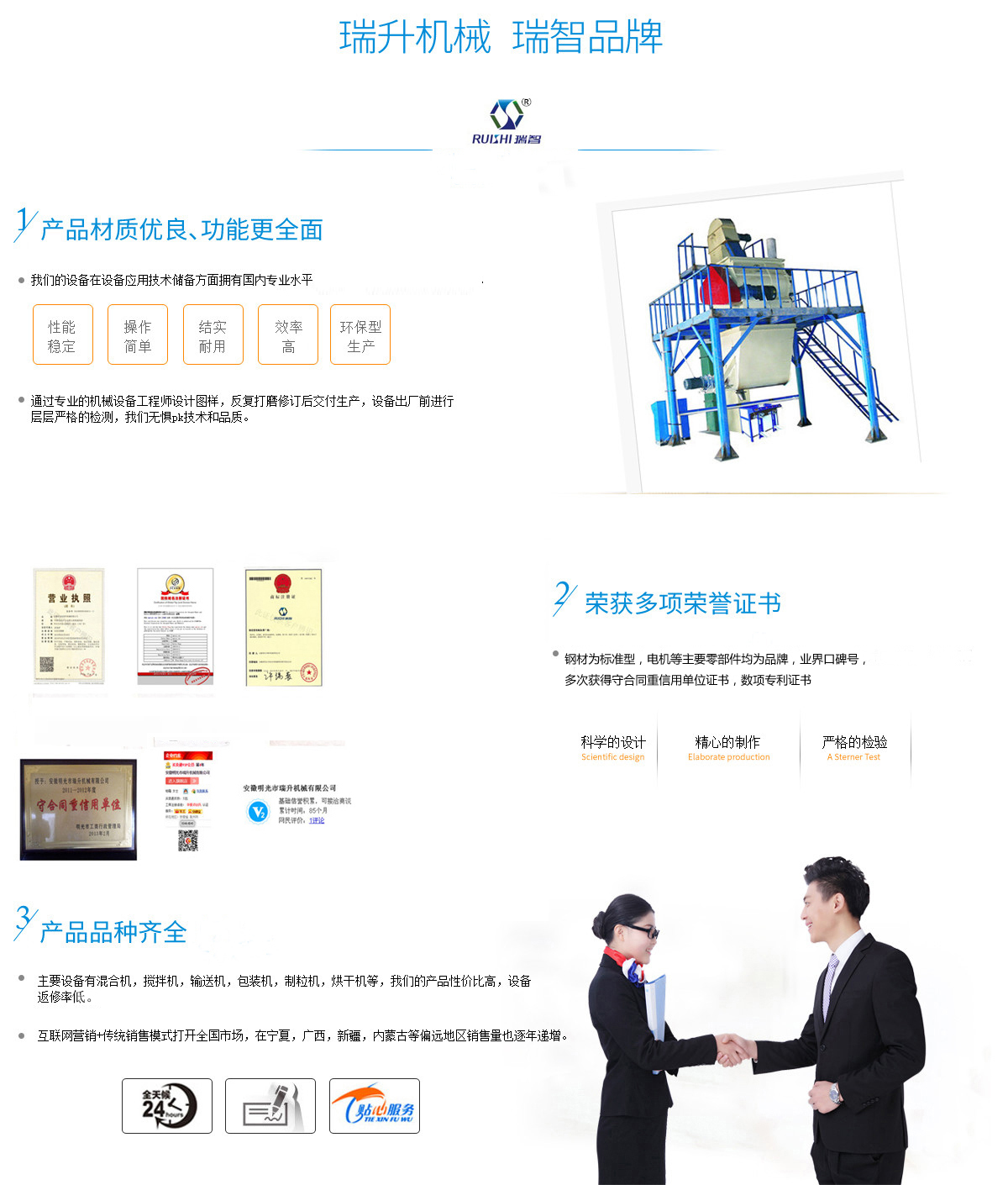 安徽瑞升機(jī)械制造有限公司坐落在明光市工業(yè)園區(qū),本公司產(chǎn)品主要用于粉料物質(zhì),顆粒物質(zhì)的混合、攪拌、輸送、包裝的自動化生產(chǎn)設(shè)備。工廠占地面積為1萬多平方現(xiàn)有6000平方米的生產(chǎn)車間和各類加工檢測設(shè)備,具備產(chǎn)品開發(fā)、研制、設(shè)計、生產(chǎn)、試驗、倉儲運輸?shù)饶芰Γ梢陨a(chǎn)多種規(guī)格、多種非標(biāo)定制的產(chǎn)品,并有多項技術(shù)獲得國家專利,擁有自主進(jìn)出口權(quán),公司憑借優(yōu)良的技術(shù)、先進(jìn)的工藝和科學(xué)的管理理念,所生產(chǎn)的產(chǎn)品已暢銷全國各地,部分產(chǎn)品已進(jìn)入馬耳他、印度尼西亞、韓國、羅馬尼亞、沙特阿拉伯、馬來西亞、印度、巴基斯坦、等國家和地區(qū),受到國內(nèi)外客戶的高度認(rèn)可和信賴。 本公司獲得守合同重信用單位證書,對原材料的采購極為細(xì)致,鋼材為標(biāo)準(zhǔn)型,電機(jī)等主要零部件均為品牌,數(shù)項專利證書。技術(shù)方面我司擁有一支國內(nèi)的技術(shù)和管理團(tuán)隊,在機(jī)械設(shè)備應(yīng)用...公司資質(zhì)榮譽
